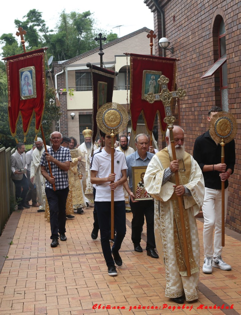 Литургијско сабрање је предводио Његово Преосвештенство Епископ Митрополије аустралијско-новозеландске Г. Силуан, а саслуживали су му протојереји Саша Чолић, Горан Ђеђез и ђакон Миладин Трипић. Посебну радост домаћинима својим учешћем учинио је гост из Руске цркве у Кројдону, о. Симон Некипелов. Такође, присутан је био и дугогодишњи парох ове цркве, умировљени протојереј-ставрофор Владислав Ђорђевић.